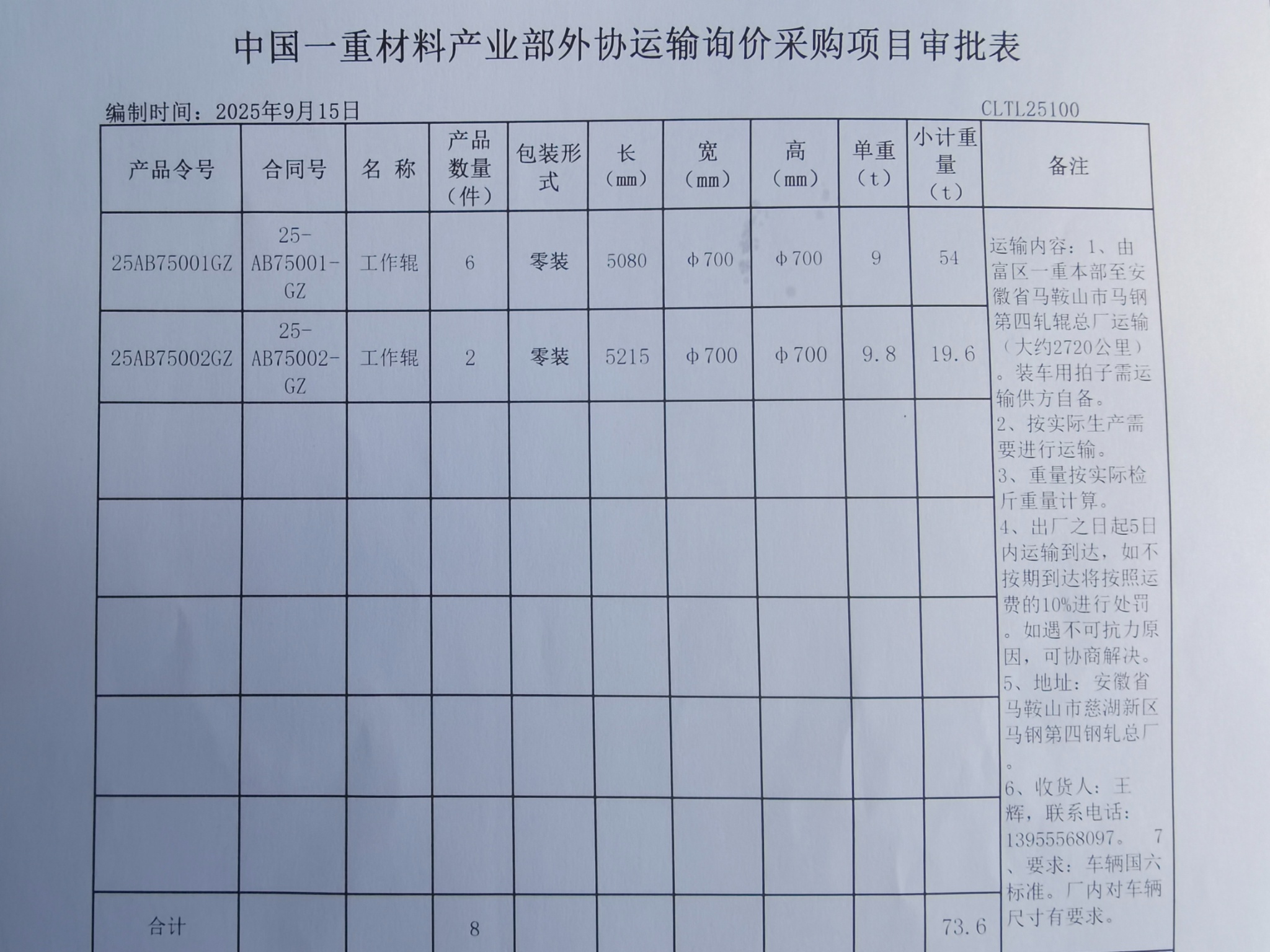 0915 富区-安徽马钢Φ700工作辊运输[ QT2025095245 ]-采购公告