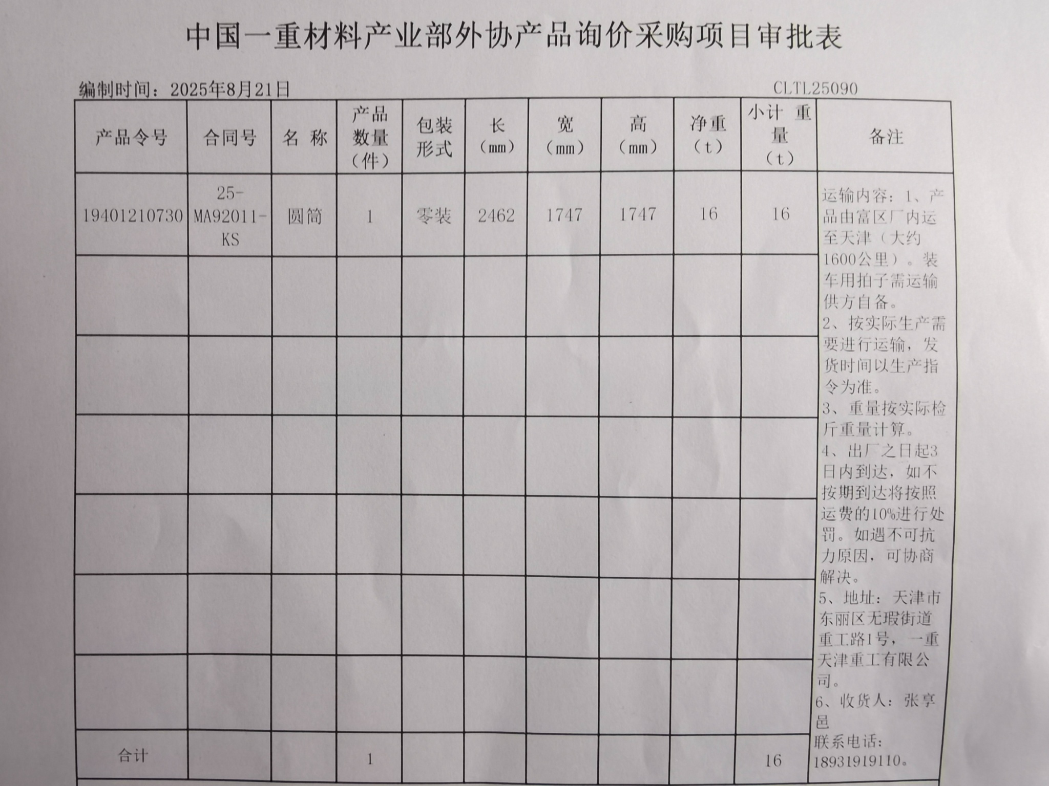 0820 富区-天津重工Φ1747圆筒运输[ QT2025083430 ]-采购公告