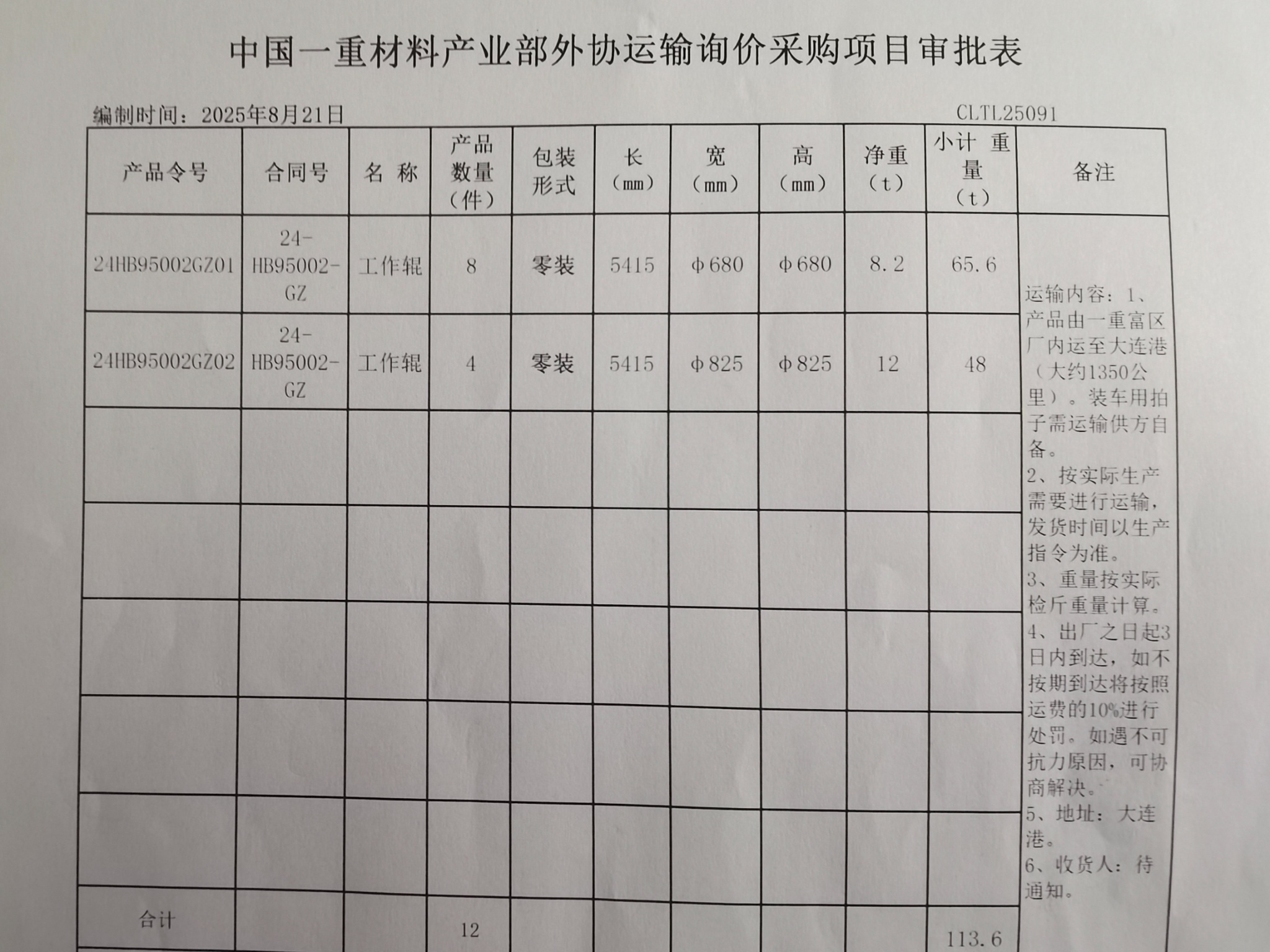 0821 富区-大连港Φ680、825工作辊运输[ QT2025083411 ]-采购公告