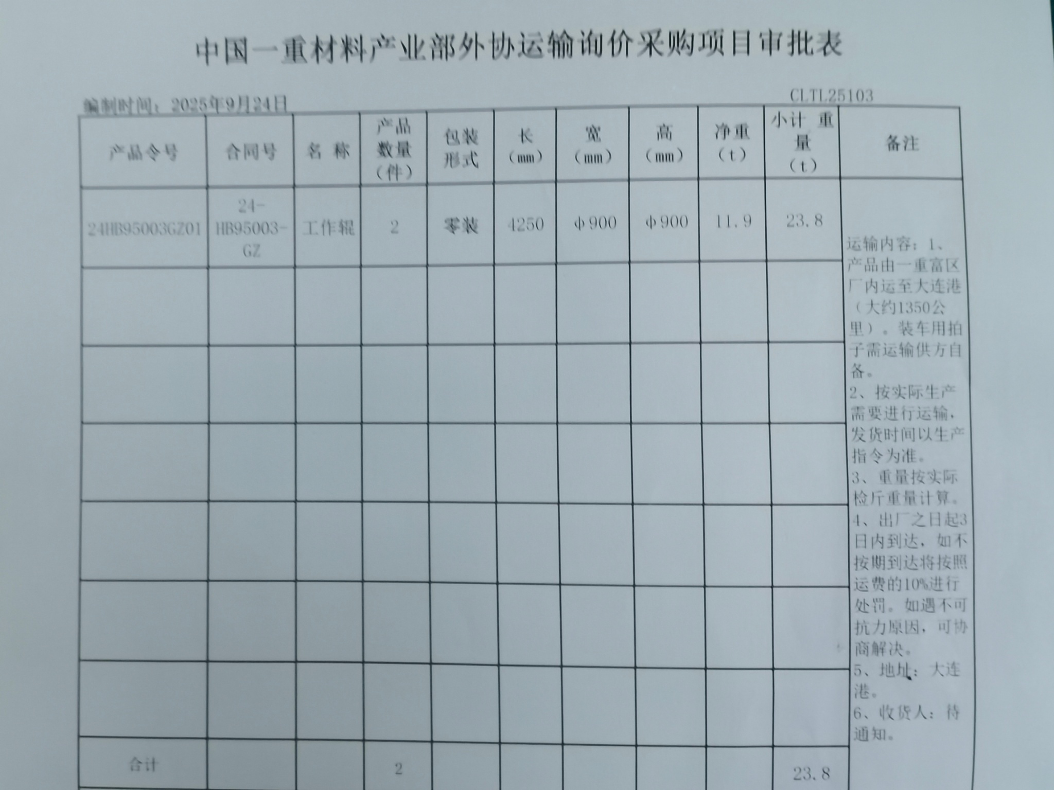0924 富区-大连港Φ900工作辊运输[ QT2025096029 ]-采购公告