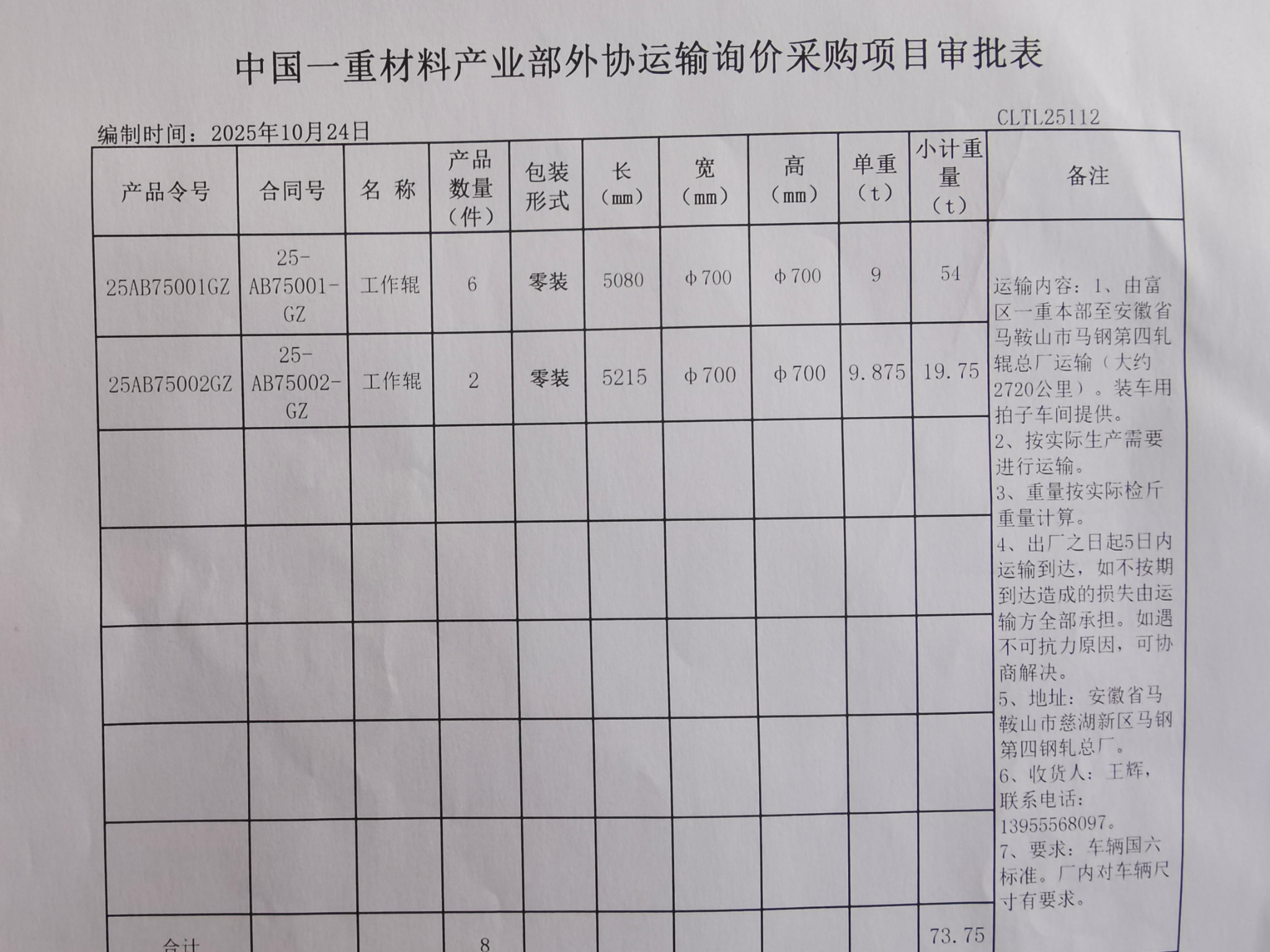 1024 富区-安徽马钢Φ700工作辊运输[ QT2025107860 ]-采购公告