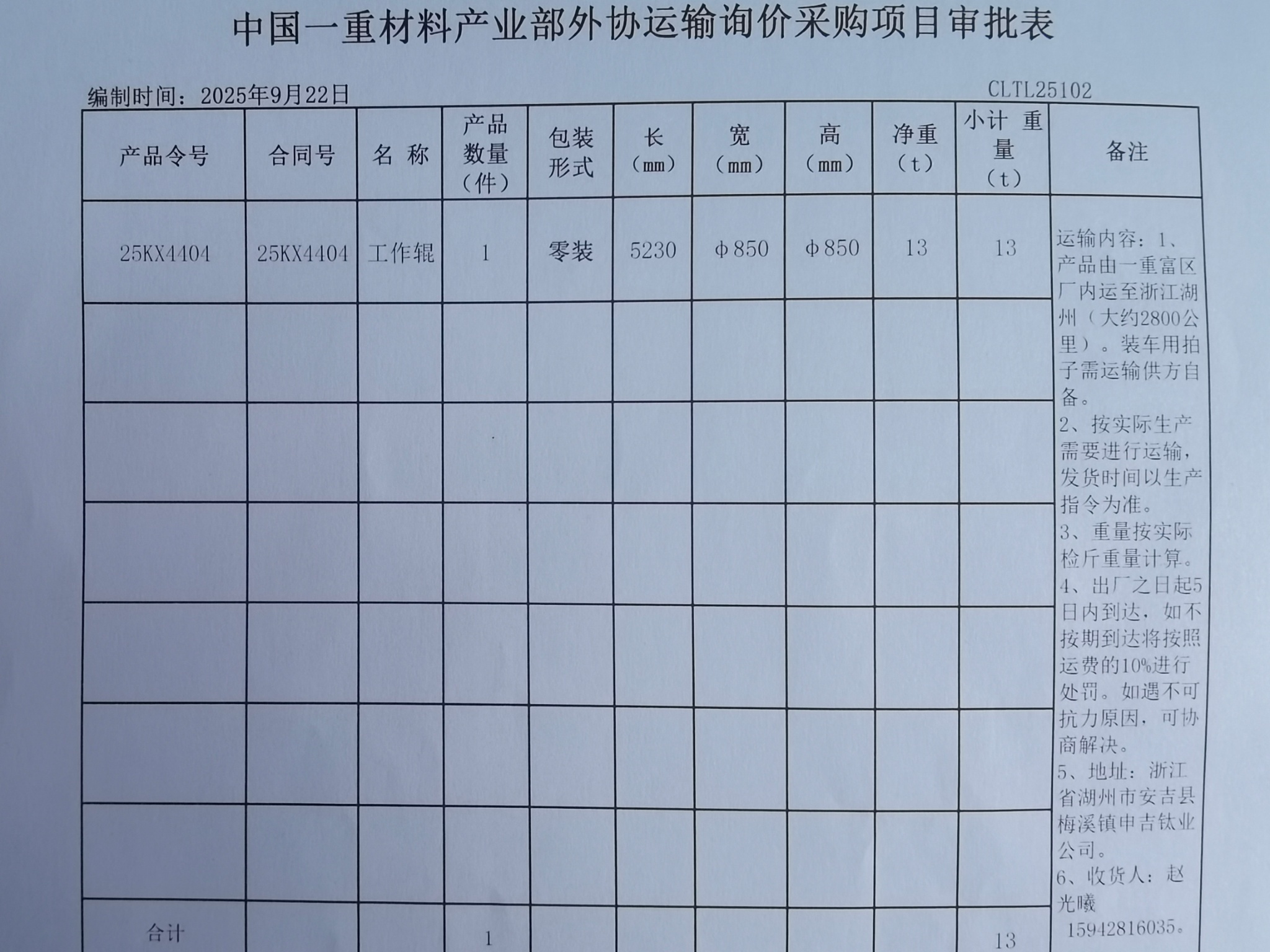 0922 富区-湖州宝钛Φ850工作辊运输[ QT2025095911 ]-采购公告