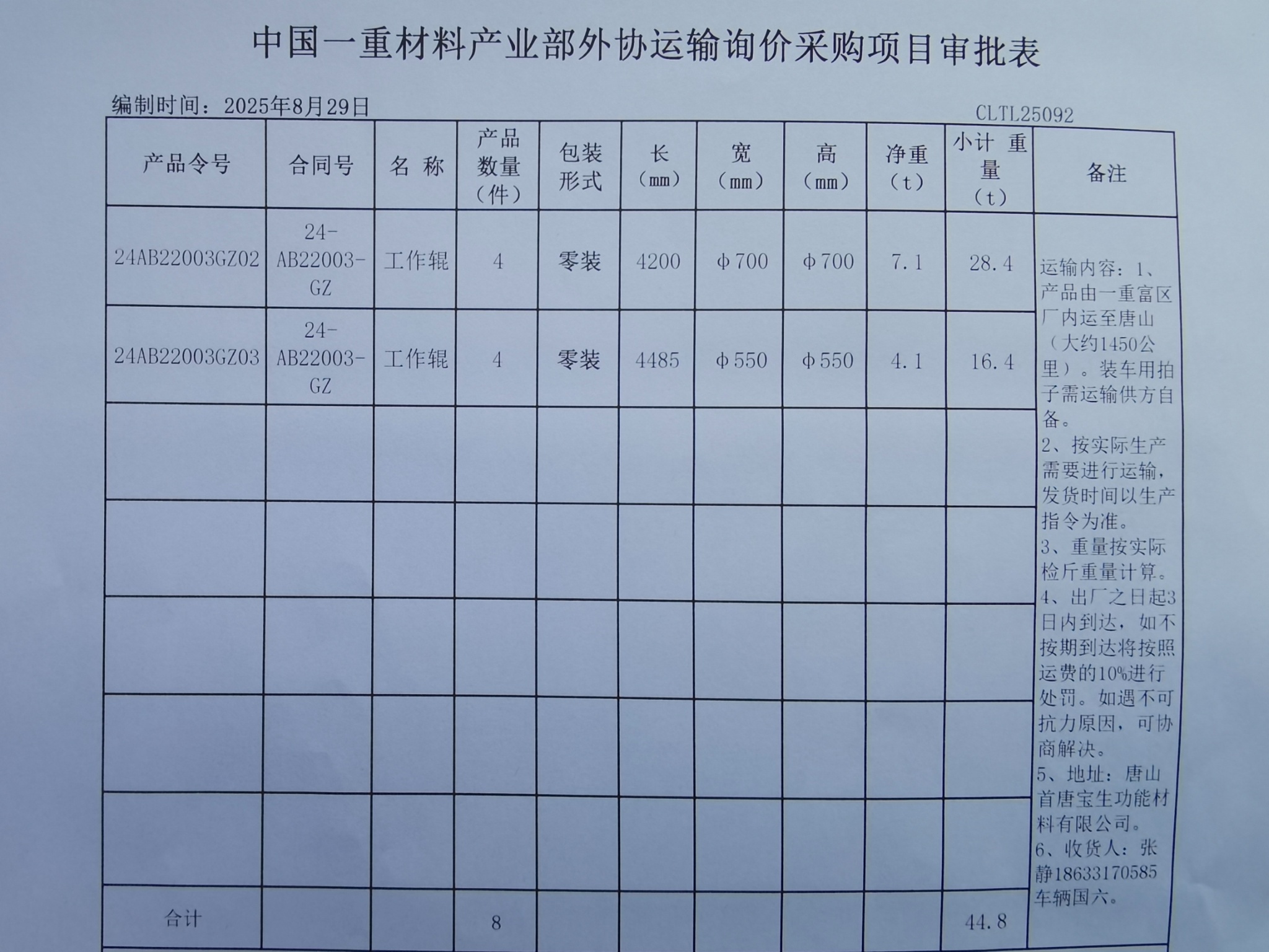 0829 富区-唐山首唐Φ550、700工作辊运输[ QT2025084006 ]-采购公告
