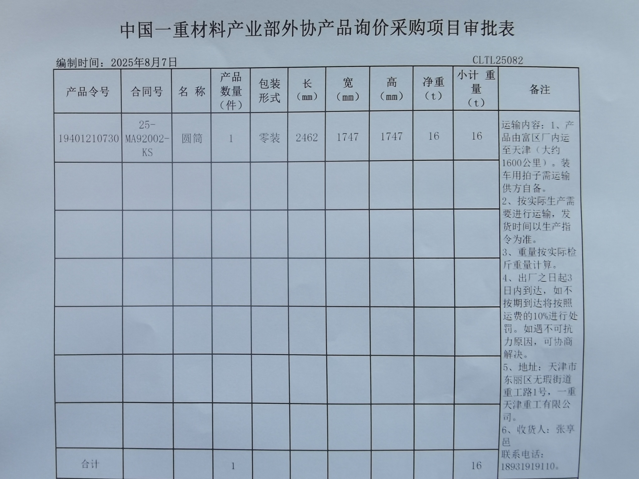 0807 富区-天津重工Φ1747圆筒运输[ QT2025082357 ]-采购公告