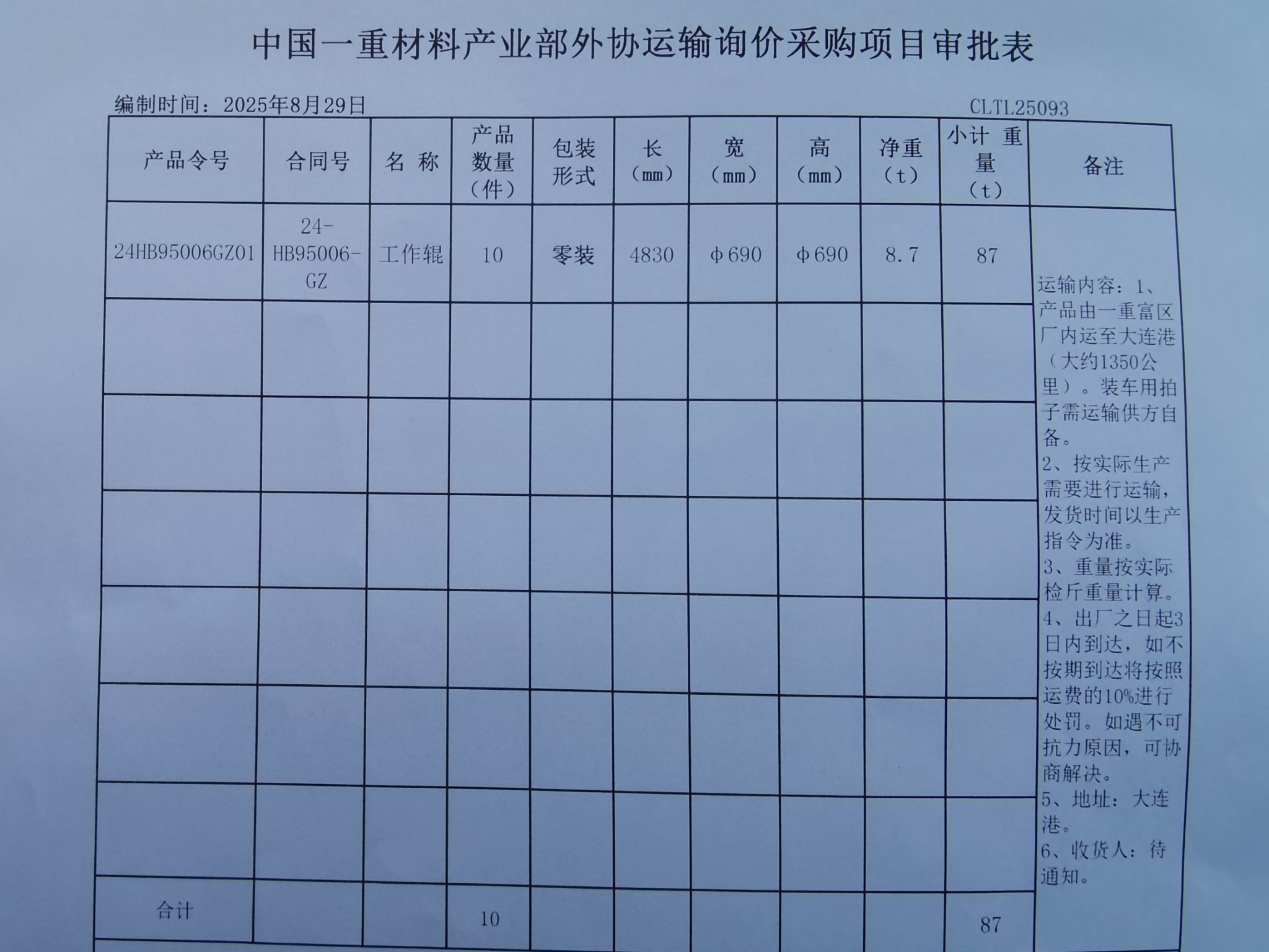 0829 富区-大连港Φ690工作辊运输[ QT2025084008 ]-采购公告